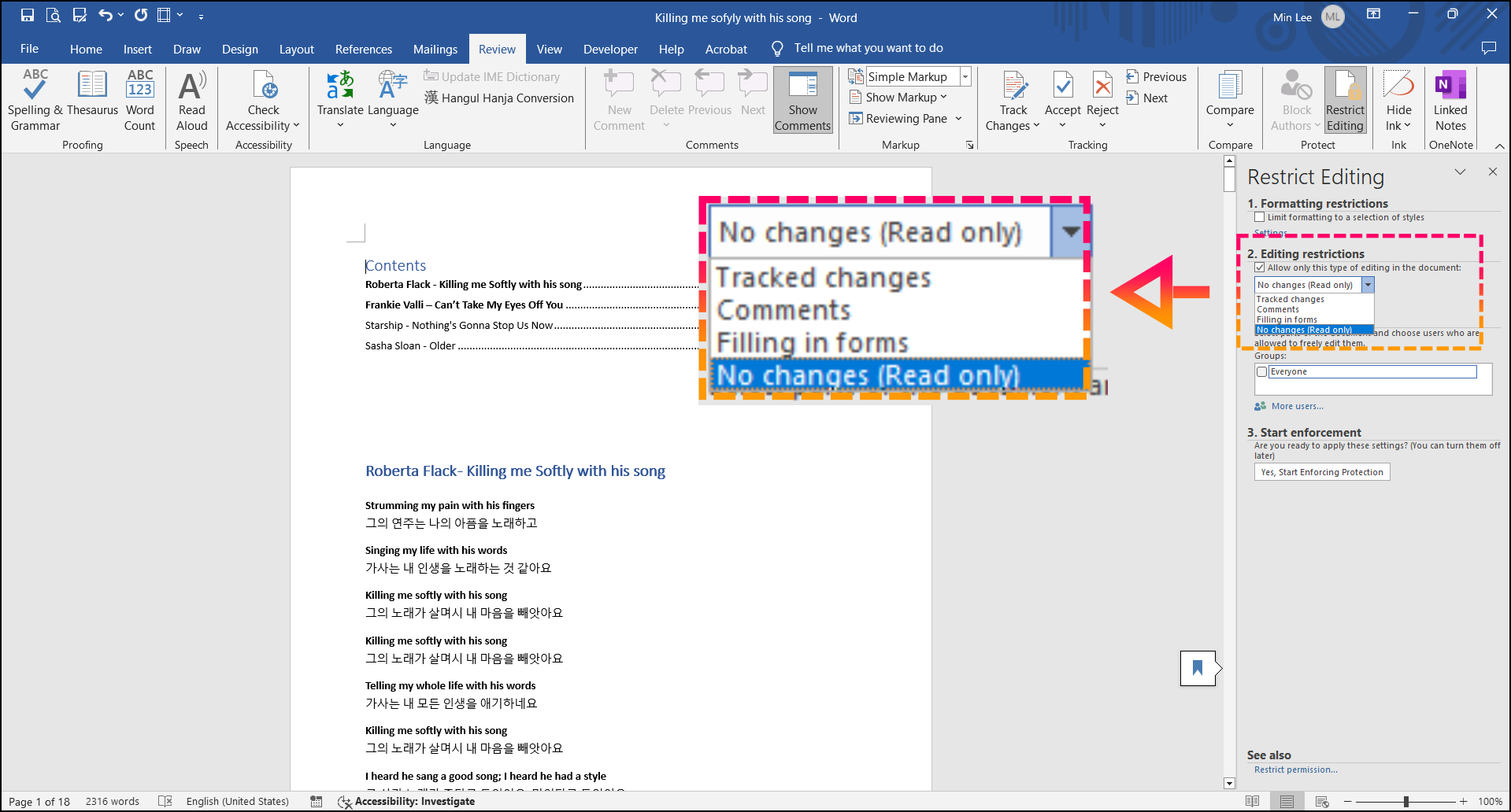 MS Word(워드)에는 서식 또는 내용을 보호하는 보호 기능이 있습니다.