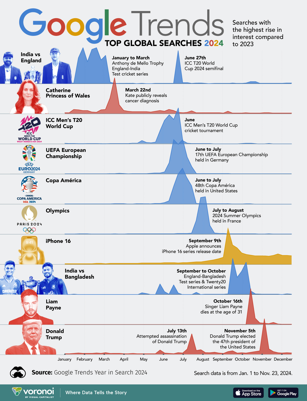2024년은 정치, 스포츠, 기술, 그리고 사람들의 이야기가 전 세계 검색 트렌드를 주도한 해였습니다. 이러한 트렌드는 사람들이 무엇에 관심을 두고 있으며, 세계적으로 어떤 사건이 사람들의 마음을 사로잡았는지 보여주는 좋은 예입니다.