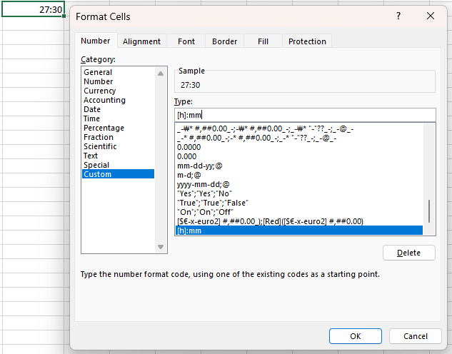 4번째 : 셀서식 [h]:mm 을 사용하면 24시간 이상 계산이 가능합니다.