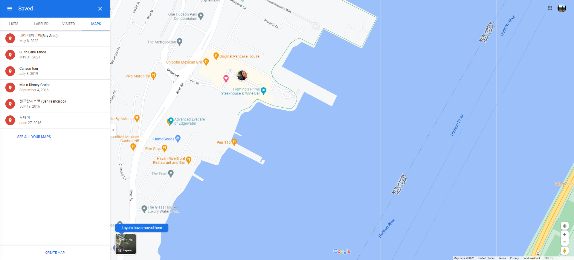 Layers를 구분하여 식당, 관광지등의 예로 구분하여 지도에 표시할 수있습니다.