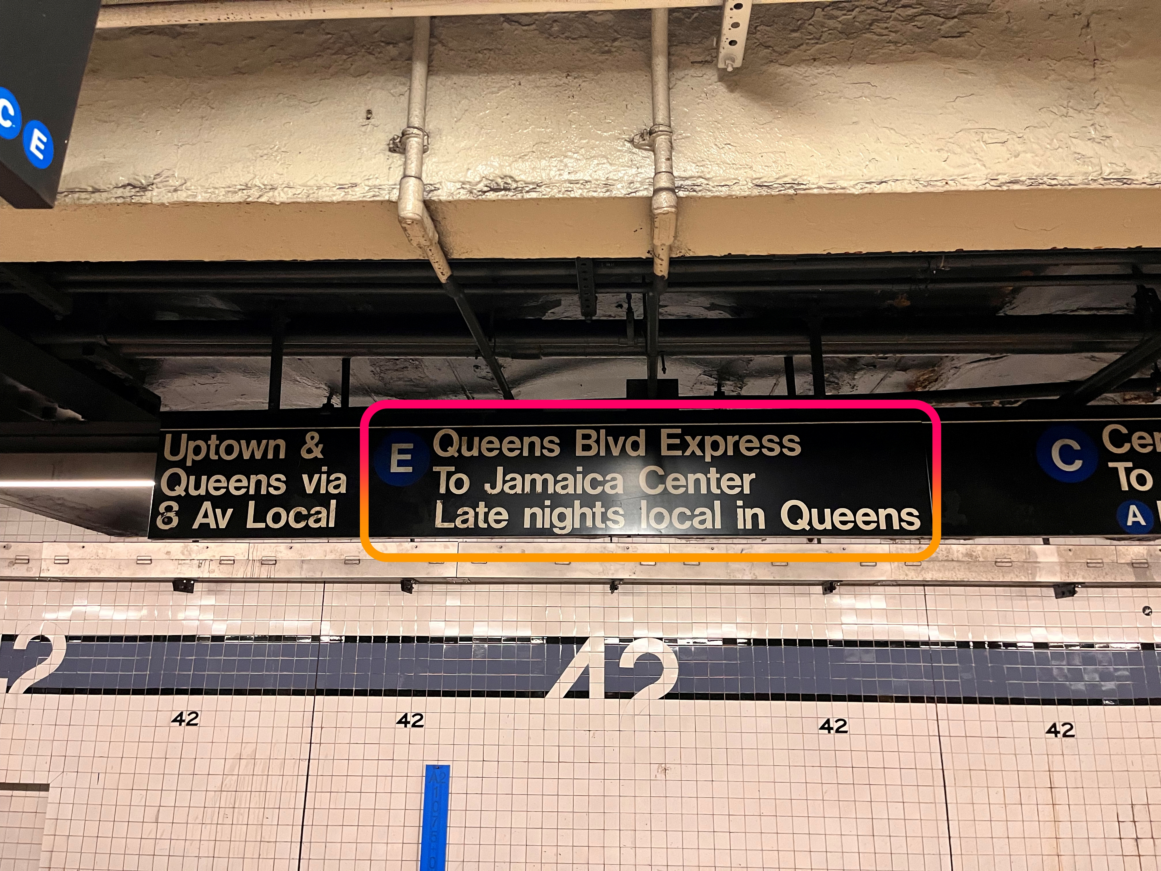 Queens 방향으로 가는 "E" 노선을 확인하고 지하철을 탑승합니다. 비용은 $1.70 입니다.